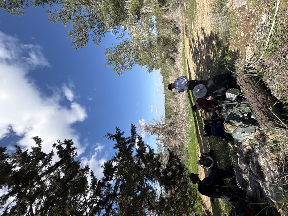 Six individuals are present in an outdoor, wooded environment within the Lachish Regional Council, Israel, under a bright blue sky with scattered white cumulus clouds