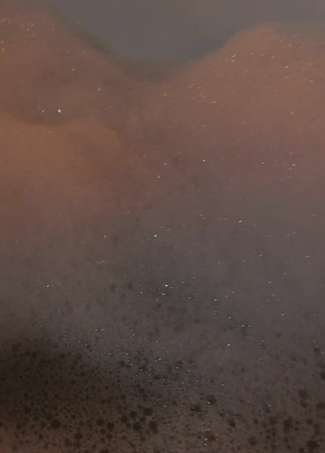 bathtub filled with dark, foamy water. The foam appears to be a mix of large and small bubbles. The water's color graduates from a light, reddish-brown near the top of the frame to a darker brown at the bottom. A light source is visible, reflecting off the water's surface.