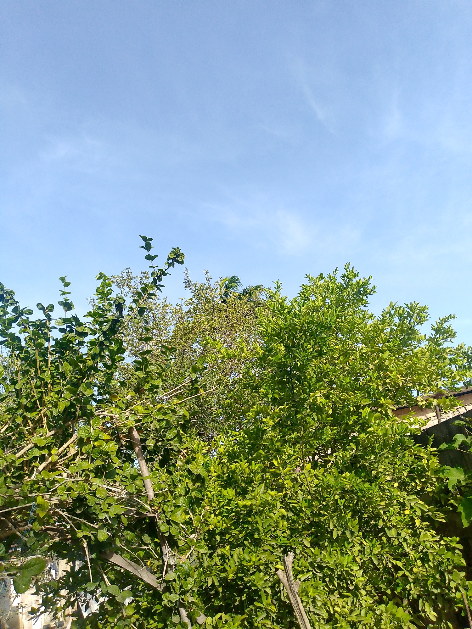 daytime view of lush, green trees against a bright blue sky with faint, wispy clouds. The foliage is dense, with varying shades of green. Visible behind the trees is a structure with light-colored walls and a section of a concrete fence. The location of the image is Juan Griego, Venezuela.