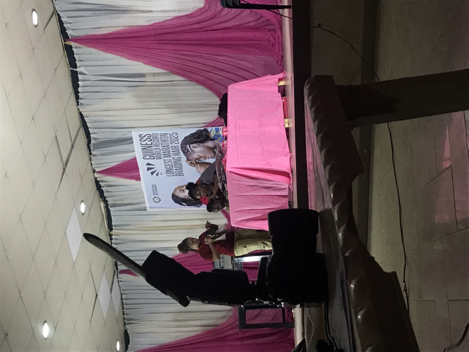 On a stage draped with pink fabric, a banner declares a "Guiness World Record Longest Marathon Braiding Hair 2025" attempt