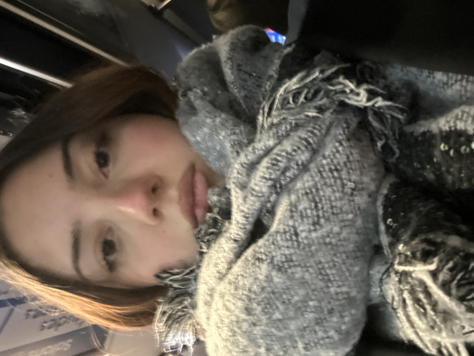 A young woman with medium brown hair is depicted in a close-up, head-and-shoulders self-portrait, looking directly at the camera with a neutral expression. Her lower face and neck are enveloped by a voluminous, light grey knitted or woven scarf, which features a prominent fringe and visible dark flecks or sequins within its material. A dark outer garment is partially visible on her left shoulder. The background is blurred, revealing the interior of a public transport vehicle, likely a tram or bus, characterized by overhead structures and subtle reflections. In the upper left background, a partially legible sign displays the word "Soeurs," which serves as an identifier for a stop or location within the public transport network of Strasbourg, France. A blurred blue and red light source is discernible in the distant right background.