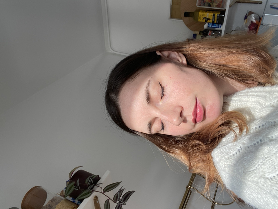 A single female subject with dark brown hair transitioning to lighter auburn ends is shown in a close-up, indoor shot. Her eyes are closed, and her lips, coated in a pink gloss, curve into a subtle smile. She wears a white, cable-knit sweater. Strong natural sunlight illuminates the right side of her face and body, casting a distinct shadow across her forehead and the left side of her face. The background features white walls. In the upper-left, a white floating shelf holds glass jars containing dry goods and a potted plant with striped leaves trailing from a pot. Partially visible behind the subject's left shoulder is a brass-toned metal fixture. On the upper-right, another white floating shelf displays items including a tall dark bottle with a yellow label, smaller containers, and a circular wooden board. A white conduit is visible near the ceiling in the upper-right corner. The image does not contain identifiable markers to specify a location within Lille, France.