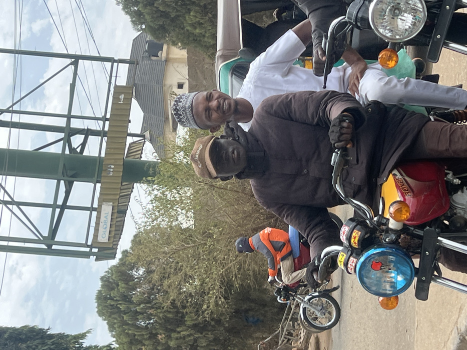 This image depicts a daytime street scene in Jos, Nigeria. In the foreground, two males are on a red and yellow "BOXER" motorcycle. The driver, on the left, has dark skin, wears a brown Callaway baseball cap, a dark brown puffer jacket, and dark gloves. His facial expression is neutral. The motorcycle features a blue-tinted left headlight and orange turn signals. The passenger, seated behind the driver, has lighter skin, wears a white patterned traditional cap (kumma), and a white short-sleeved top; his expression reveals teeth. In the mid-ground, to the left of the main subjects, another individual is riding a red motorcycle, identifiable by an orange and black jacket, light trousers, and a dark head covering. Further to the right in the mid-ground, a partial view of a green Keke NAPEP (tricycle taxi) is visible behind the foreground motorcycle, along with the headlight and handlebar of another motorcycle on the far right. The background features a large, empty green metal billboard structure marked "GLOBAL" centrally. To the left of the billboard, dense green foliage is present. To the right, a light-colored building with a grey, multi-pitched roof is visible, surrounded by additional trees and shrubs. The sky is overcast or hazy.