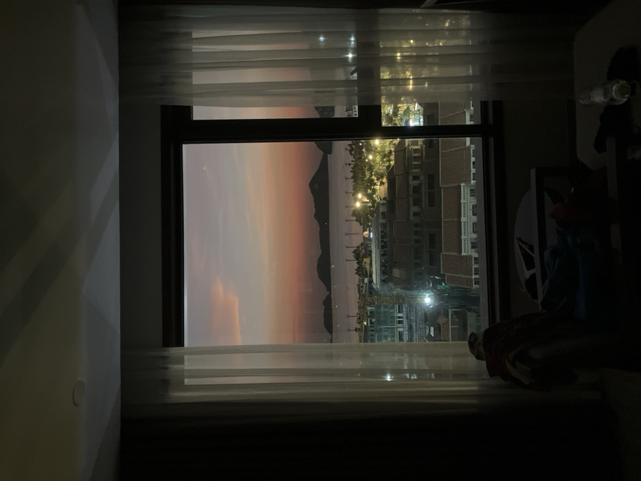 The image depicts a high-angle view from a dark interior room, looking out a large window at a coastal cityscape during sunset. The sky displays a gradient of deep orange, pink, and pale blue, with faint cloud formations. On the horizon, numerous dark, irregular-shaped landmasses, characteristic of limestone karsts or islands, silhouette against the sunset over a body of water. This specific landscape strongly suggests the Cat Ba Archipelago within Hải Phòng, Vietnam, facing a bay resembling Hạ Long. Below the water, the city of Hải Phòng is visible with numerous illuminated buildings and streetlights. Prominent are multi-story structures, some featuring traditional-looking tiled roofs, interspersed with brighter, more modern sections and areas under construction. Streetlights line coastal roads or promenades. Inside the room, the foreground is dark, revealing a section of a ceiling and parts of a wall. Sheer, light-colored curtains are drawn back, framing the window. In the lower foreground, a dark surface, possibly a desk or table, holds a clear plastic water bottle with a white cap on the right side, and a pile of dark fabric, likely clothing, on the left. No individuals or active interactions are visible in the scene.