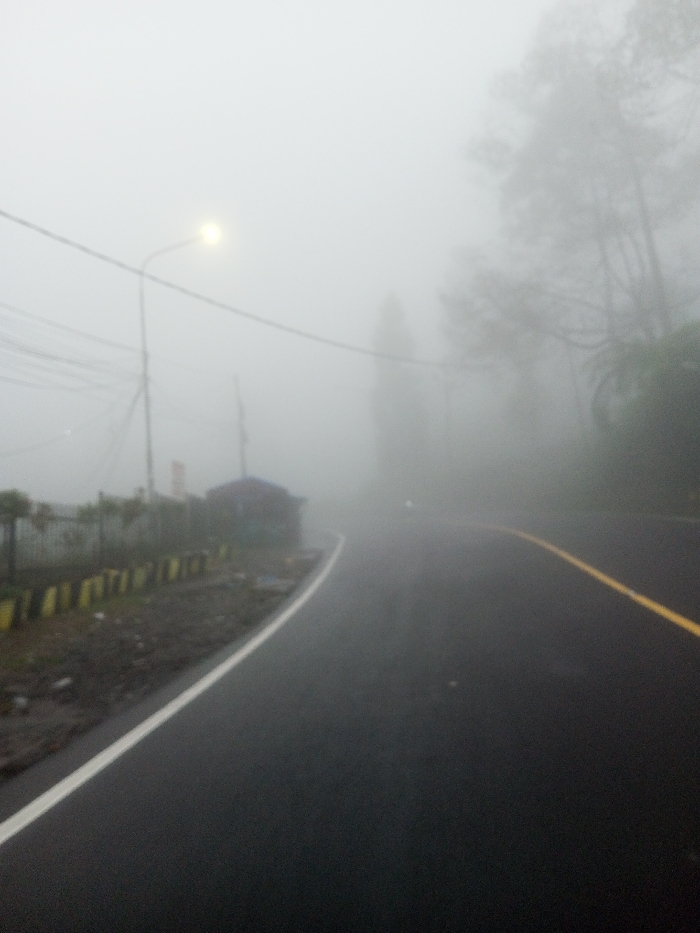The image depicts a foggy road scene in Dawathang_Dorjibi_ Kashingtsawa, Bhutan