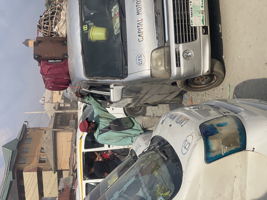 The image depicts a bustling outdoor scene in Nnobi, Nigeria, characteristic of a transportation hub or market area. In the foreground, two vans are parked closely on a dirt and gravel surface. The van on the left is white, partially visible, with "CAPITAL MOTOR" and "CTS" printed on its front. Its front right headlight is taped or painted blue, and a yellow reflective decoration is visible on the dashboard. To its right, a silver Suzuki van, also marked "CAPITAL MOTOR" and "CTS," is present. This silver van has a Nigerian license plate, "DELTA GMW-983ZA," on its front bumper. A red suitcase and a brown wheeled suitcase, along with other bundled items, are secured to its roof rack. A yellow plastic bucket hangs inside its windshield, and paper currency is visible on the dashboard. Its front left wheel is a bare steel rim. Between these two vans stands a male individual, appearing to be in his late 20s or early 30s, of African descent. He wears a red baseball cap, a light teal hooded sweatshirt with long sleeves, and light-colored pants. A black crossbody bag with a patterned strap is slung over his shoulder. He leans casually with his right arm resting on the open driver's side window frame of the silver van, looking towards the left. In the mid-ground, behind the main subject, another white van is visible with several people inside, including one in a black t-shirt and another in a red and white patterned outfit. The background features various multi-story buildings of beige and brown hues, some with green roof elements. Overhead power lines and poles are prominent. A sign partially displaying "bet9ja" is visible on one building. In the far background, a distinct brown-domed or spired structure, possibly a church, rises above the other buildings. The sky is clear and bright, indicating daytime. The ground throughout the scene is unpaved, dusty, and shows scattered debris.