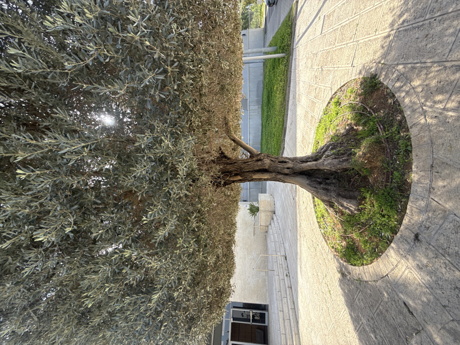 The image depicts an outdoor scene in the city of Unknown, Israel, featuring a prominent olive tree under bright sunlight