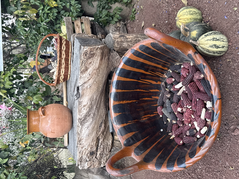 The image displays an outdoor arrangement of agricultural products and traditional items in Sanctorum, Mexico. In the foreground, a large, handled, rust-orange ceramic bowl with black painted accents rests directly on reddish-brown earth. This bowl contains a quantity of small, dried corn cobs in various hues, primarily dark purple/black and maroon/red, mixed with some lighter kernels. To the right of the bowl, three small, variegated green and cream-striped gourds or pumpkins are positioned on the ground. Midground elements are situated on a rustic platform constructed from rough-hewn, stacked wooden logs. On the left side of this platform, an unglazed, two-handled terracotta pot holds a bouquet of white and pink flowers and green leaves. To the right of the pot, a small, oval-shaped woven wicker basket containing an assortment of dried corn cobs in various colors (white, yellow, speckled, dark) is visible. A light-colored wooden stick lies horizontally behind the terracotta pot on the platform. The background consists of dense green foliage and vines, suggesting a garden or natural outdoor setting, with soft, natural lighting. No individuals are present in the scene.