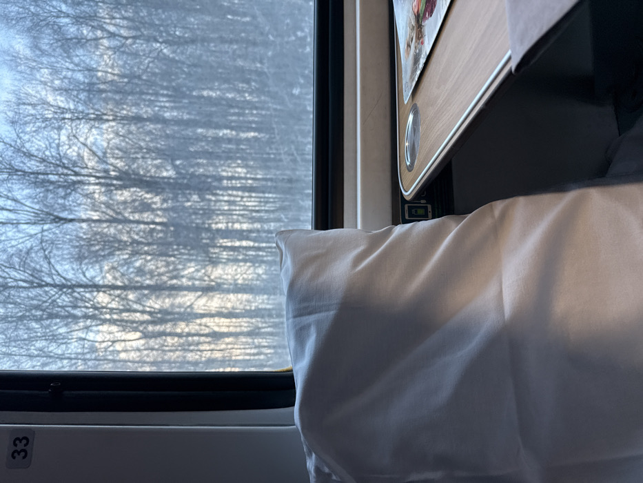 A stark view from a train window reveals bare trees silhouetted against a pale sky. The window frame is black, and the wall is white with the number 33 visible. Inside the cabin, a white pillow rests against a wooden table, partially obscuring a charging device. The muted palette creates a contemplative, almost monochromatic scene.