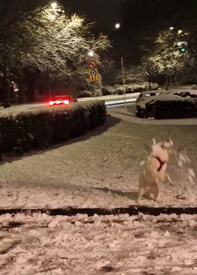 white dog with a red harness playing in the snow on a winter night. The dog is first standing on its hind legs, then runs in the snow-covered area near a building. The area is lit by streetlights, and there are trees and parked cars visible in the background. A car with red tail lights can be seen driving down a street in the distance. The ground is a mix of snow and bare patches.