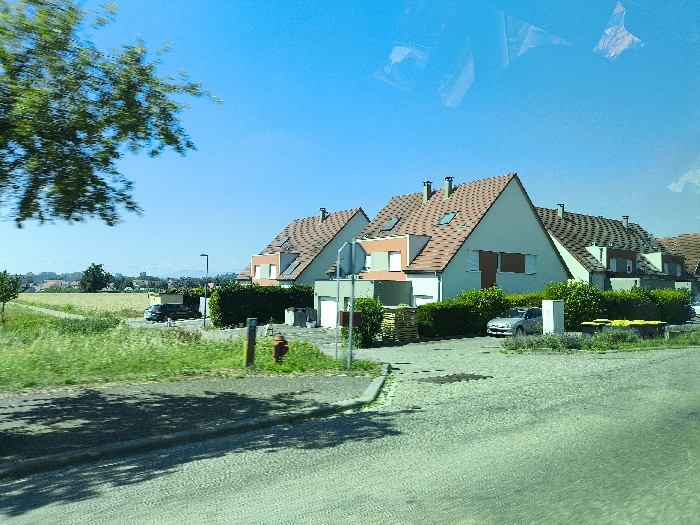 A neighborhood with houses with orange-tiled roofs under a bright blue sky. A field of farmland is visible in the background, along with a few trees. The houses are surrounded by green hedges and some cars parked in front. In the foreground is a road and some grass on the side. A fire hydrant is visible in front of one of the houses.