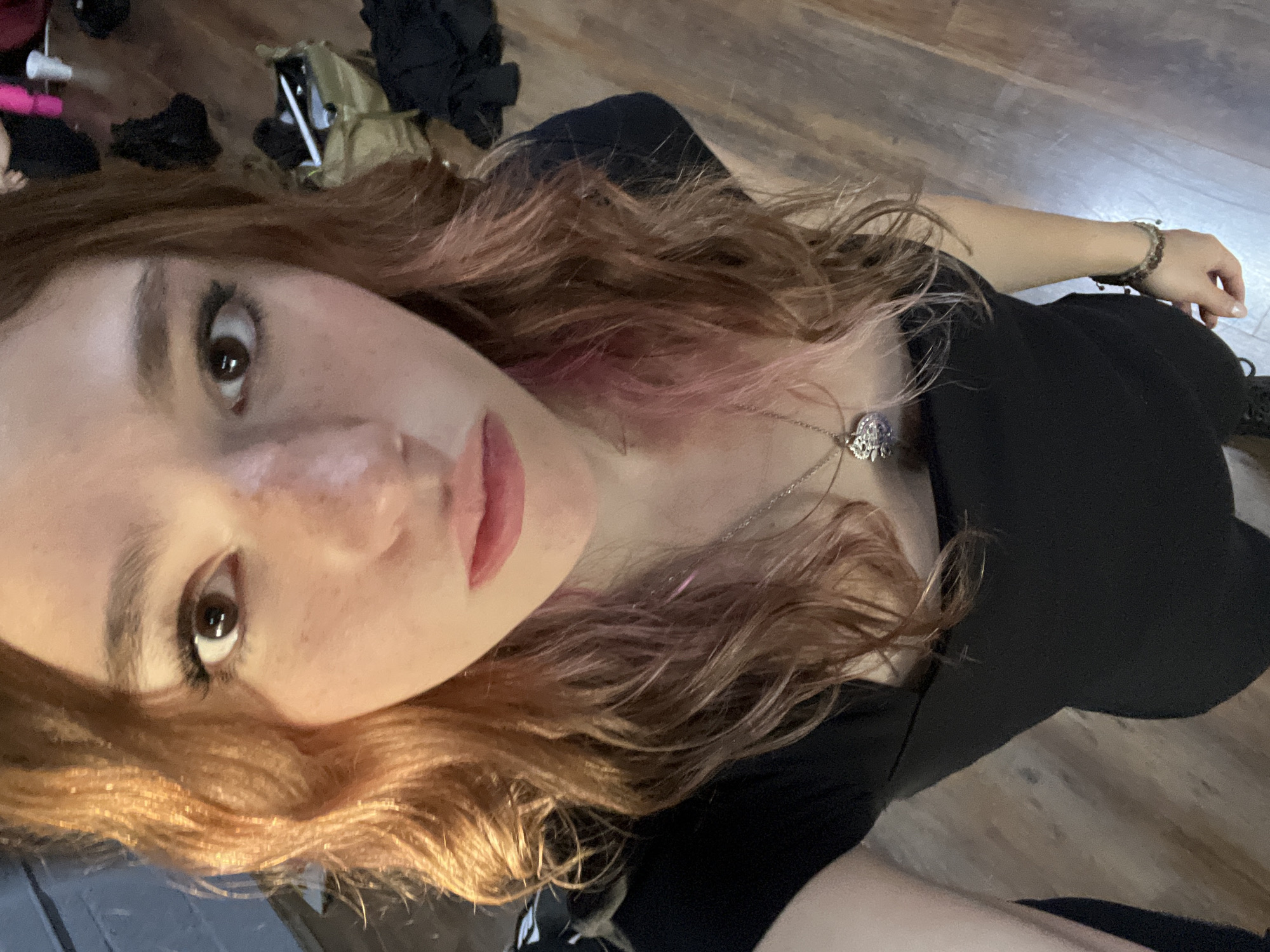 The image displays a close-up, low-angle portrait of a female subject, identified as being indoors in San Bernardino Tlaxcalancingo, Mexico. The subject has fair skin with visible freckles across the nose and cheeks, brown eyes with dark eyeliner, and dark eyebrows. Her hair is wavy, predominantly auburn or light brown, with distinct strands of pink highlighting. She wears a black top with a square neckline, a silver-toned necklace featuring a circular, possibly ornate, pendant, and a multi-beaded bracelet on her right wrist. Her lips are full and tinted with a light pink color. The background consists of a light brown wooden floor with a visible grain pattern. Scattered on the floor, primarily to the right of the subject, are various items: a light-colored fabric bag (possibly khaki or light brown) partially open with contents, a white disposable cup, and several dark fabric items, possibly clothing. A textured, dark wall is visible on the far left.