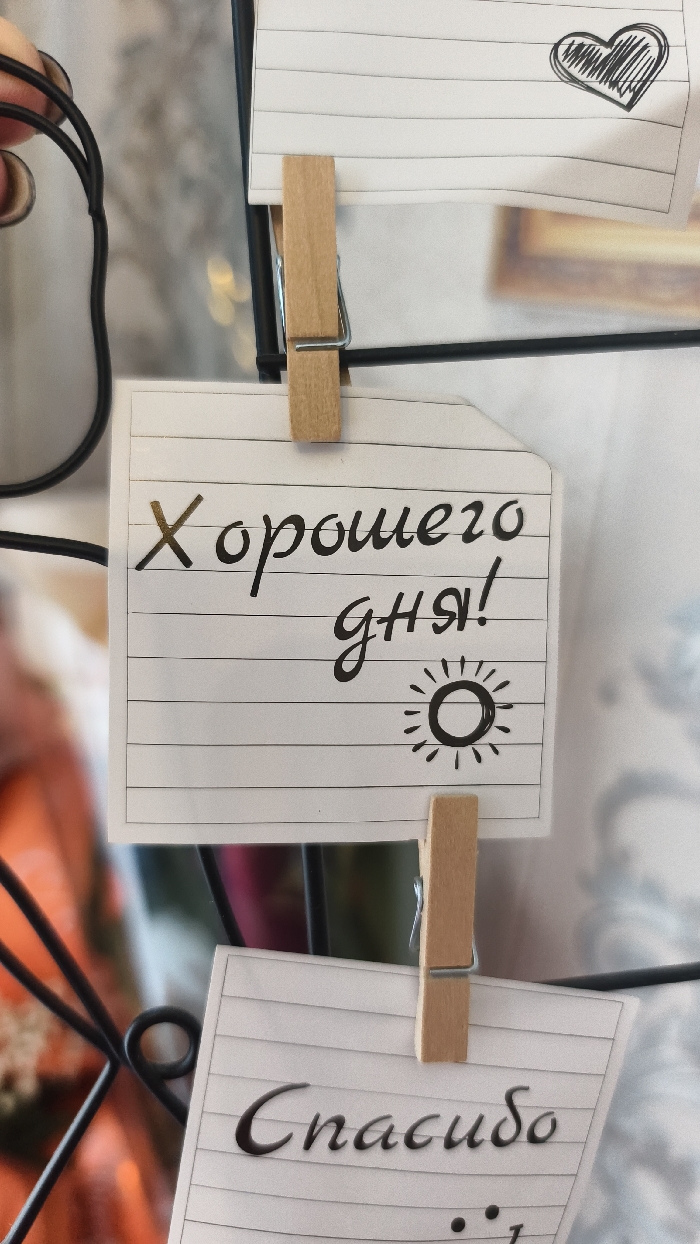 The image displays a close-up view of three distinct white, lined note cards clipped to a black wire display grid. The central, horizontally oriented card features the handwritten black Russian phrase "Хорошего дня!" (Have a good day!), accompanied by a simple black hand-drawn sun icon below the text. This card is secured by a small, light brown wooden clothespin with a silver metal spring. Partially visible above, another white, lined card is clipped, displaying a black, scribbled heart drawing in its top right corner. Below the central card, a third white, lined card is clipped, showing the partial black Russian word "Спасибо" (Thank you). In the upper left quadrant, a human hand with two fingers, exhibiting light-colored nail polish, holds a thin black cable or wire. The background is softly blurred, revealing a light-colored wall or surface, a rectangular object with warm, brown hues, and indistinct warm-toned elements. The scene is located in the city of Chaikovsky, Russia.