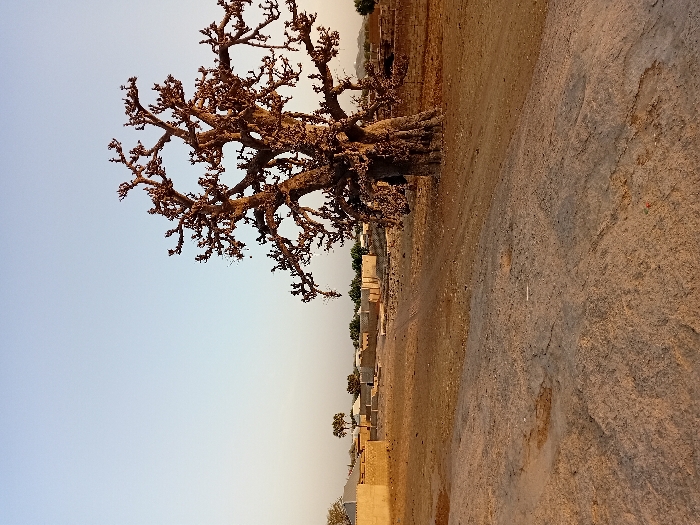 A large, bare tree with many branches dominates the left side of the image, set against a pale blue sky