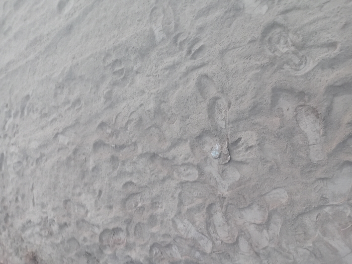 close-up view of a sandy or dusty ground surface. Numerous footprints of various sizes and shapes are imprinted across the terrain, indicating pedestrian traffic. A small, bright object is also present amidst the footprints. The ground surface appears to be relatively uniform in color and texture, with slight variations in shading due to the footprints and surface irregularities. The overall impression is that of a well-trodden area.