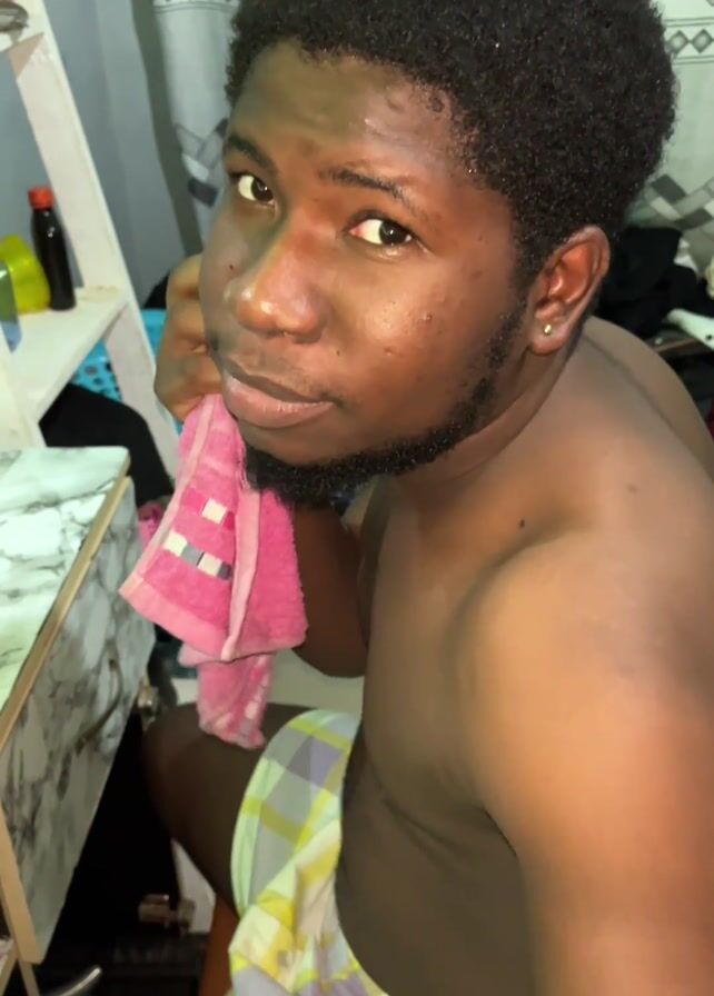 Here is a detailed description of the video: A young man with dark skin, short curly black hair, and a trimmed beard is sitting in what appears to be a bathroom or bedroom. He is shirtless and wearing yellow and white checkered shorts. He is holding a small, pink and white towel to his face, seemingly drying it. At one point, he sticks out his tongue. The background includes a white desk with a faux marble top, a white ladder shelf with various bottles and items, and a blue laundry basket filled with clothes. A shower curtain with a gray and white geometric pattern is visible in the background as well.