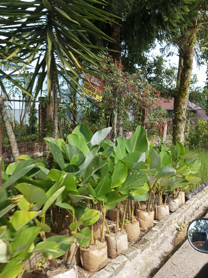 This image presents a street-level view in Kandenuwara, Sri Lanka. The scene is dominated by a display of potted plants arranged along a concrete curb. Approximately 14 to 15 plants, each featuring broad, green leaves, are individually contained in light brown, fabric-wrapped pots. These pots are aligned linearly on a low, gray concrete barrier that separates them from a darker, possibly paved area or drainage channel. In the background, dense foliage and multiple trees are visible. A tree on the left exhibits long, slender, pointed leaves, while a thicker tree trunk on the right shows signs of moss or lichen growth. Partially obscured by the trees and foliage in the upper mid-ground, a rectangular sign in yellow and red with white lettering is present. The legible text on this sign reads "RUMAH DAN TANAH" (Indonesian for "HOUSE AND LAND") and "LUAS: 800 M2" (Area: 800 square meters). Behind the vegetation, parts of buildings can be discerned, including a structure with a sloped roof on the right and a metallic fence or wall on the left. The sky above is bright. A partial view of a vehicle's side mirror is visible in the lower right corner, reflecting a distorted image of the surroundings. No people are visible.