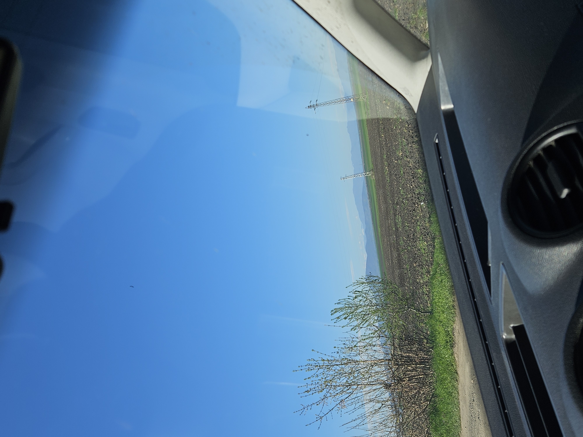 The image, taken from inside a vehicle, shows a view of the landscape near Varbitsa, Bulgaria. The scene consists of a bright blue sky and a field. In the distance, there are electrical towers and mountains. A bush with sparse foliage is visible closer to the vehicle. The vehicle's dashboard and the side of the windshield are visible in the foreground.