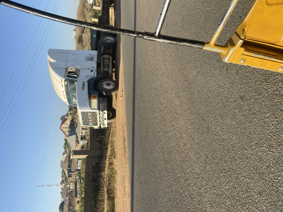 A white Mack truck is parked on the side of a road. Houses and a tower are visible in the background. The sky is blue. A portion of a yellow vehicle, with black bars, appears in the top right of the frame. The road is asphalt.