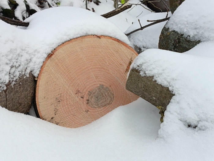 - "The image displays a close-up view of a recently cut log's cross-section, partially embedded in and surrounded by undisturbed white snow" by FM-rFWs12, licensed under CC BY 4.0