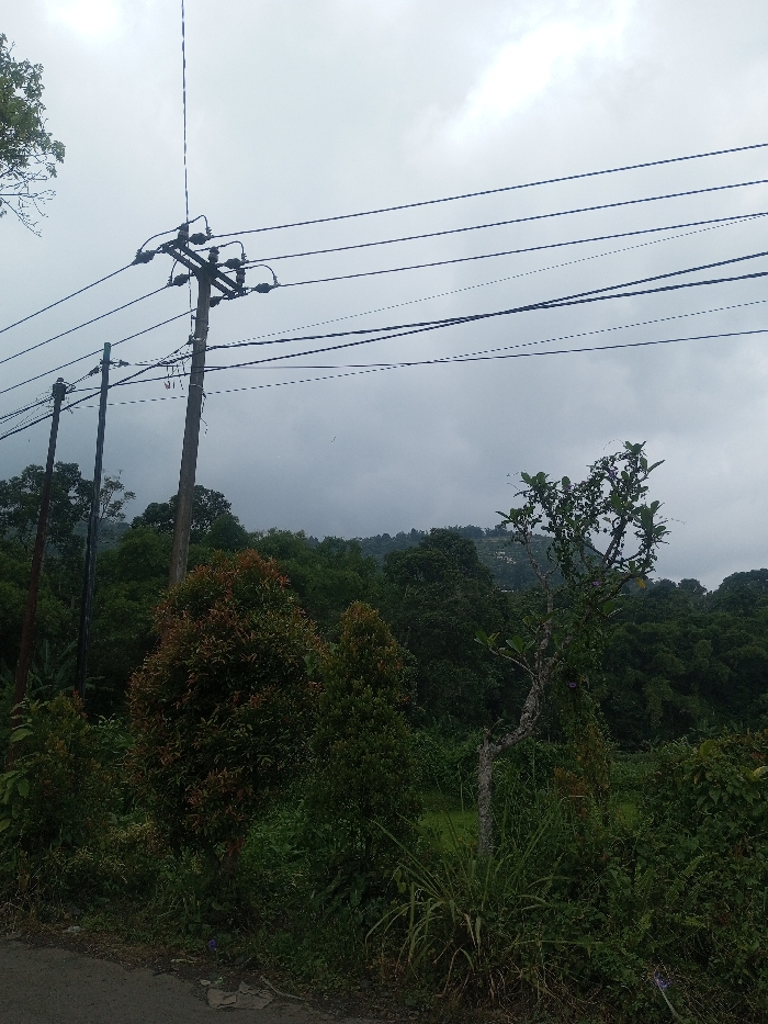 The image displays an outdoor, vegetated landscape under an overcast sky in the city of Unknown, Vietnam. A dark, paved road segment occupies the lower-left foreground, bordered by dense ground cover and varied green foliage. Two utility poles stand on the left: a primary dark-colored pole in the mid-left features multiple cross-arms supporting numerous black electrical and communication wires that traverse the upper portion of the frame. A secondary, thinner pole is partially visible behind it. The mid-ground contains lush green vegetation, including bushes with some reddish-brown new growth, and a distinct, gnarled tree trunk with lighter bark on the right. The background consists of densely forested hills or mountains beneath a heavy grey cloud layer, with subtle indications of distant structures on the upper slopes. The scene contains no visible people or discernible actions.