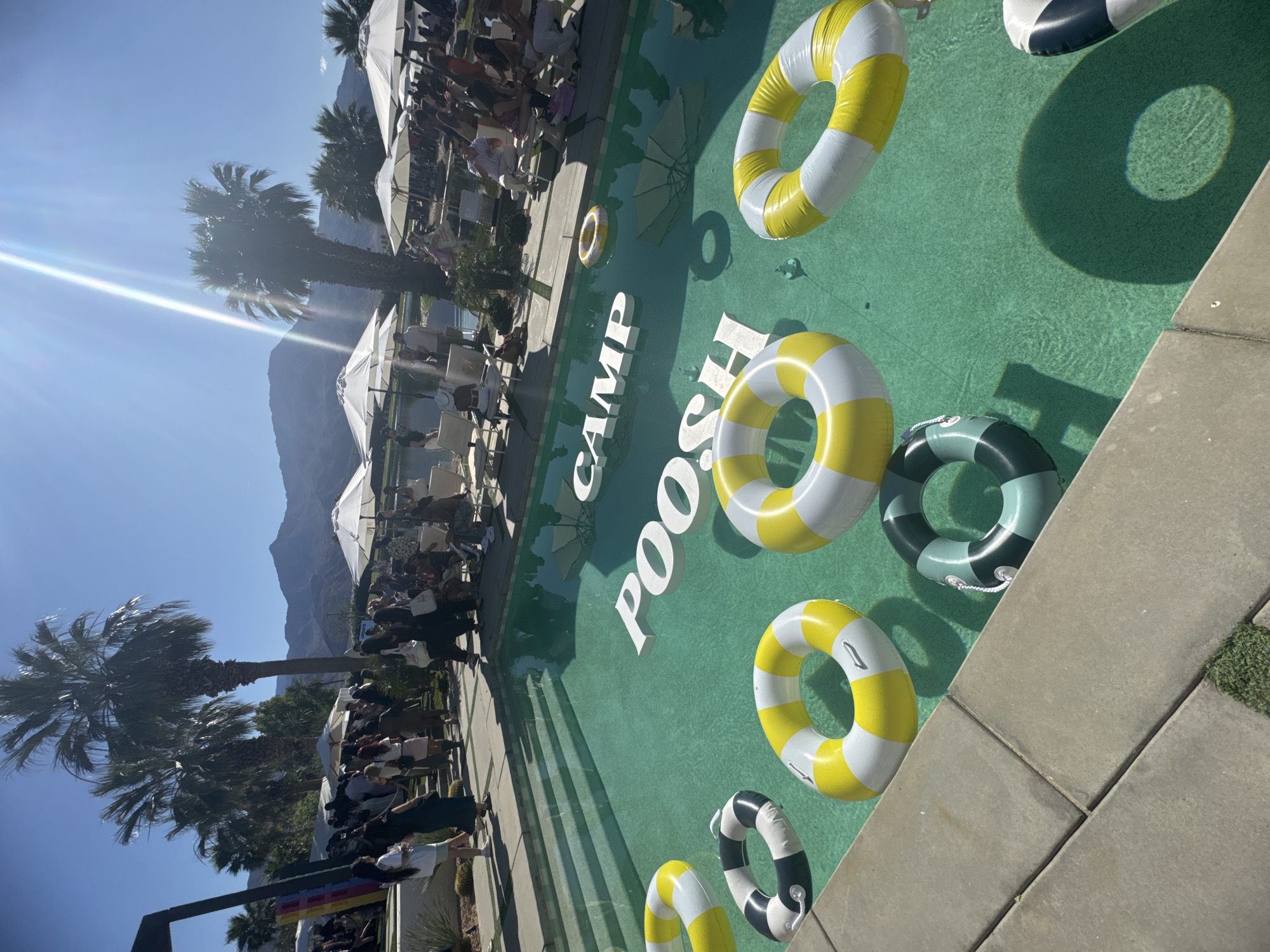 The image depicts a swimming pool at the "Camp Poosh" event in La Quinta, California, United States. The pool contains several inflatable rings of yellow/white and black/white colors. The pool has "CAMP POOSH" written on the bottom. The area around the pool is populated with people, tables, and white umbrellas. Palm trees are visible in the background, as well as a mountain range. The scene is well-lit with sunlight.