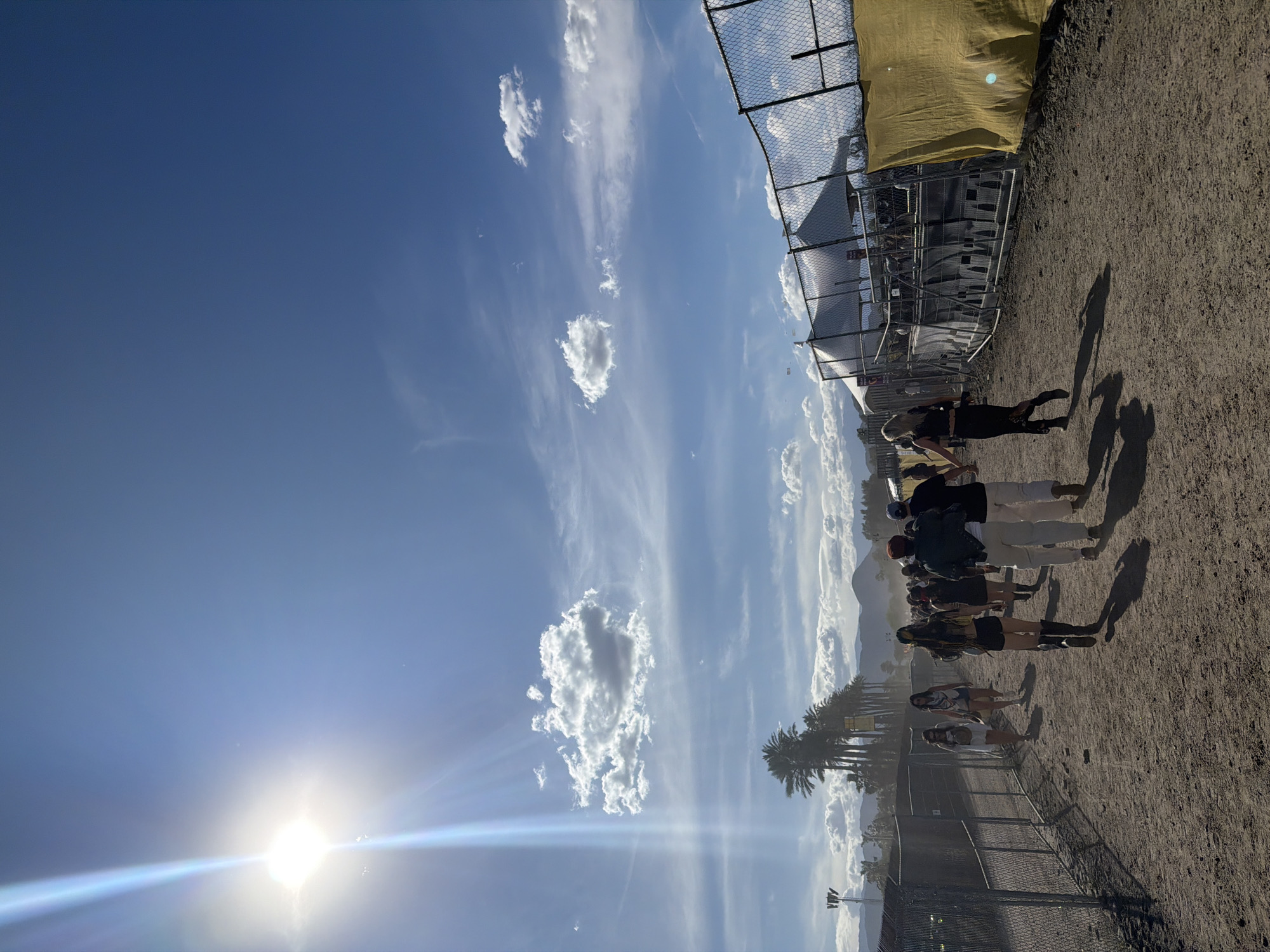 The image depicts an outdoor scene in Indio, California. A group of people are walking in a dirt area adjacent to a chain-link fence and a large tent-like structure. Palm trees are visible in the background. The sky is blue with scattered clouds, and the sun is shining brightly.