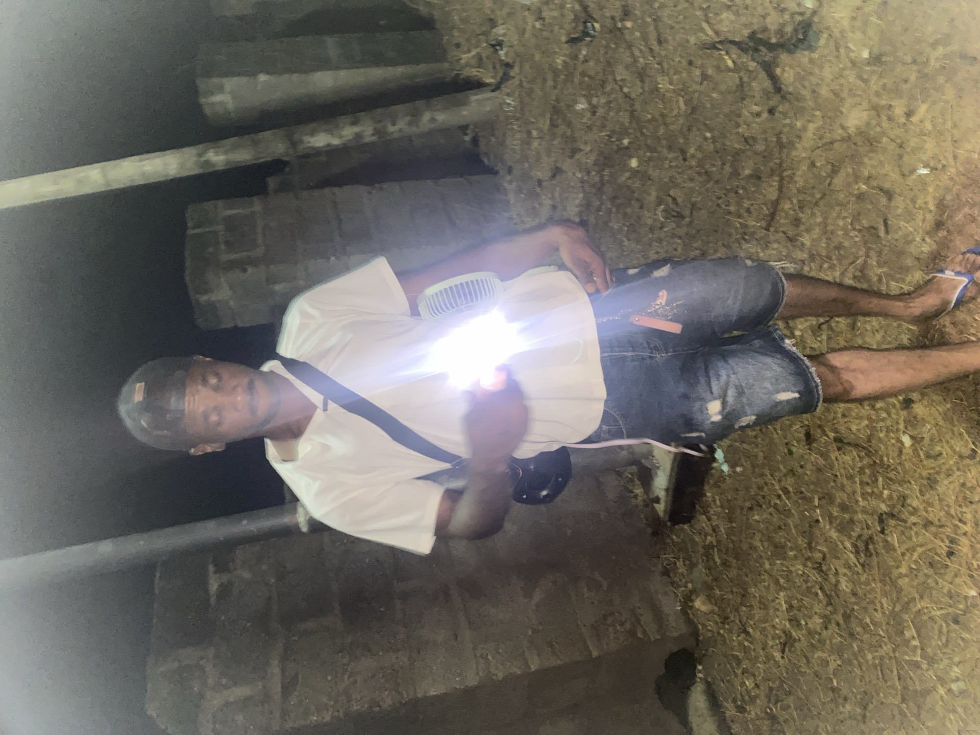 A man stands on what appears to be a dirt road or ground in Katsina Ala, Nigeria. He is wearing a white T-shirt, dark denim shorts, and flip-flops. A strap crosses his chest. He is holding a light. The environment seems dimly lit. There is a structure made of stones in the background, on the left. To the right is ground covered in a thatch-like substance.