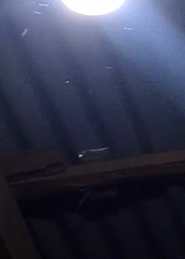 A low-angle shot shows a bright circular light source illuminating a dim space with dust motes visible in the light beams. The background appears to be the underside of a roof structure, with dark wood visible. The camera is mostly still, with slight adjustments in angle.