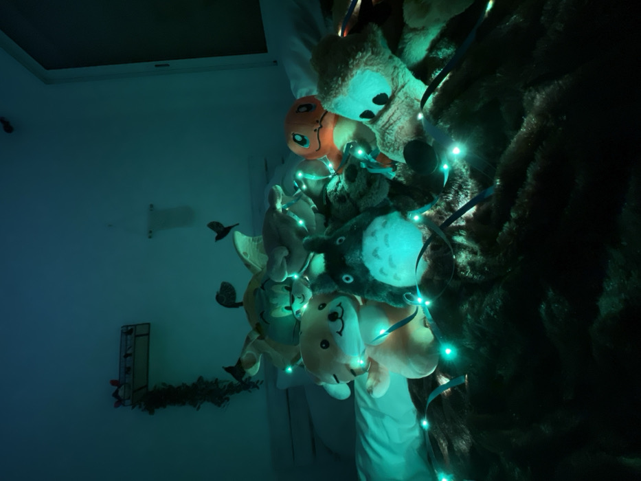 This image depicts a dimly lit bedroom scene in Canet de Mar, Spain. A collection of approximately six to seven plush toys are arranged on a dark, textured, furry blanket or bedspread. A string of bright teal/cyan LED lights is intertwined among the toys, serving as the primary light source and casting a pervasive blue-green glow across the subjects and immediate environment. In the foreground, from left to right, are a light brown fox or dog-like plush with a smiling face, a gray Totoro plush with a white belly, and a shaggy brown plush, possibly a monkey or dog. Behind these, an orange Charmander plush is visible to the right. Other indistinct plush figures, including one appearing light yellow with large ears, are clustered further back. The plush toys are static, posed to face the viewer. White bedding is visible directly behind the arrangement. The background shows a plain wall, predominantly dark teal due to the lighting. On the left wall, a small decorative shelf or rack with dark, dangling foliage is mounted. A faint outline of a door frame or another architectural feature is visible on the right side of the background. No people are present, and no overt actions or interactions are depicted beyond the arrangement of the objects.