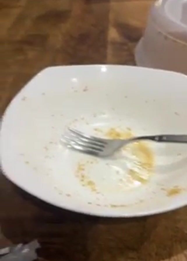 A hand opens an empty plastic Coca-Cola bottle with a red cap on a wooden table. There is a dirty white plate with a fork and food scraps to the right of the bottle. In the background are other items, including a white box and a clear, white lidded food container.