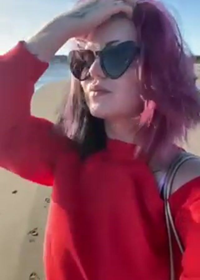 A woman with pink and black hair stands on a beach, wearing heart-shaped sunglasses and a red, off-the-shoulder sweater. She touches her hair as the wind blows. The beach is sandy, and the ocean is visible in the background under a clear blue sky. The sunlight is bright, and there are some footprints on the sand.