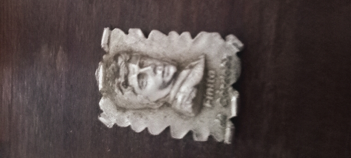 A metallic, stamp-shaped religious medal lies on a dark, flat surface. The medal features a male figure's head in profile, facing left. The edge is serrated like a postage stamp. There is text along the right side of the figure, possibly religious in nature. The image has some blurriness and appears to be taken under subdued lighting, casting soft shadows. The medal shows signs of wear and oxidation.