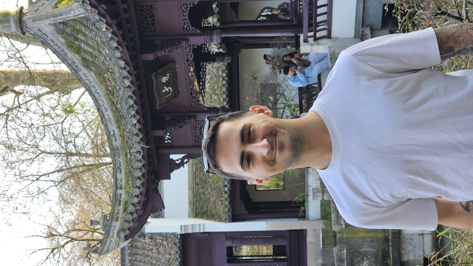 A forensic examination of the image reveals a male subject positioned in the foreground, centered, looking directly at the viewer with a slight smile. He has short dark hair, sunglasses resting on top of his head, and is wearing a plain, light-colored, short-sleeved t-shirt. A tattoo is visible on his left forearm. The background depicts a traditional Chinese-style architectural complex, identifiable as the Chinese Garden within Bethmannpark, Frankfurt am Main, Germany. The primary structure features dark reddish-brown wooden pillars, ornate carvings, and multiple curved, tiled roofs with visible moss and leaves. A decorative plaque with Chinese characters is affixed to the structure's upper section. Further back, a white-walled building with dark window frames is partially visible. In the mid-ground, beneath the main architectural structure, several individuals are present. Two individuals, a male in a light blue hoodie and a female with dark curly hair wearing a brown jacket, are seated on a dark bench, appearing to consume items from small containers. Another person is partially visible further to the right. The immediate foreground shows dry grass or shrubbery. The distant background features bare deciduous trees against a bright sky, indicating a season outside of full foliage. The lighting suggests natural daylight.