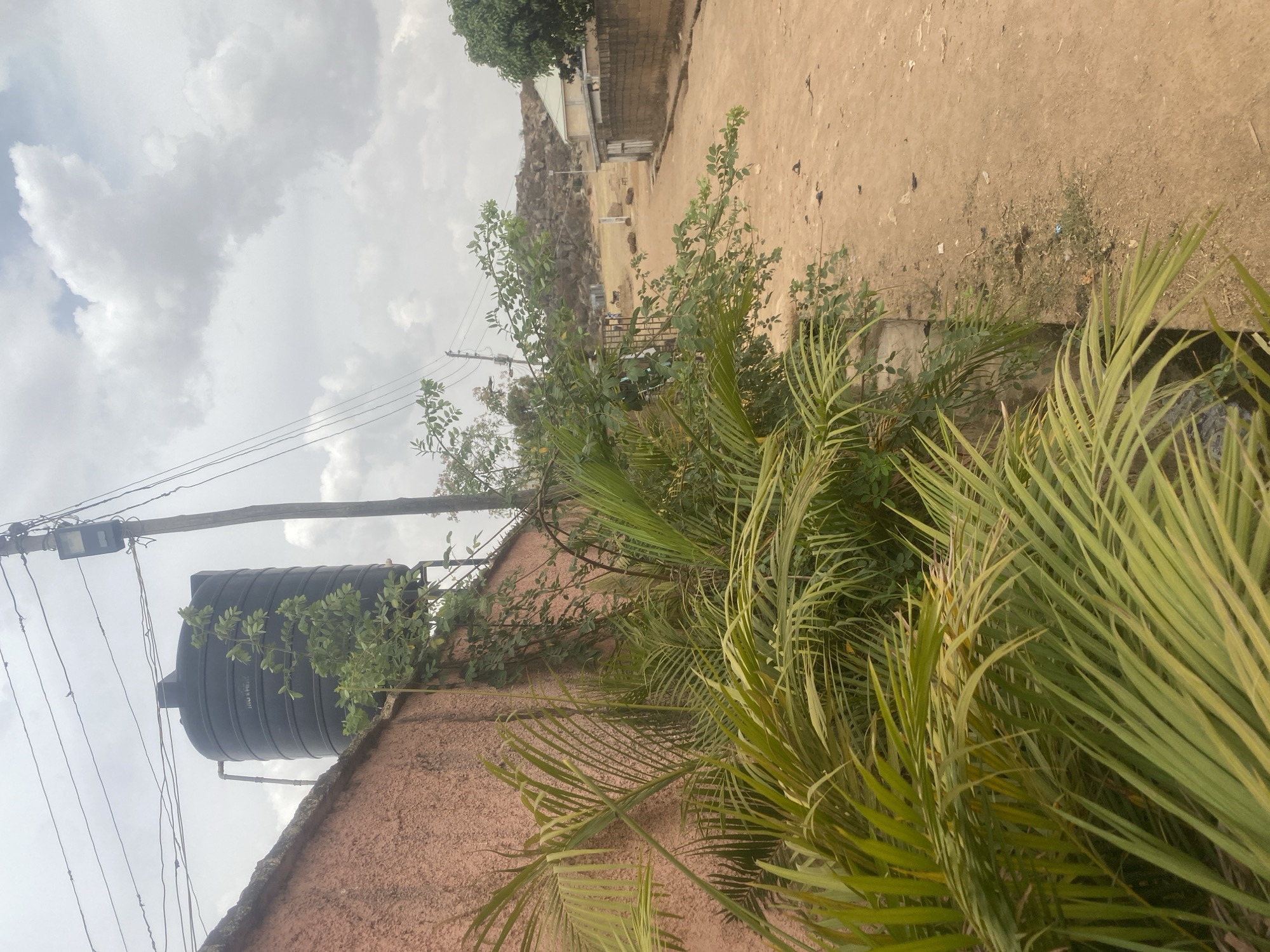 This image depicts an unpaved, reddish-brown dirt road in an outdoor residential or semi-urban area of Jos, Nigeria, under an overcast sky. In the foreground, dense green foliage, primarily large palm-like fronds, occupies the lower left, extending upwards along a reddish-orange textured wall that runs diagonally into the mid-ground. Behind and above this wall, a large black plastic water tank, possibly a GPE brand, is mounted on a black metal stand. To the right of the water tank, a wooden utility pole with multiple overhead power lines and a rectangular street light/floodlight is visible. The dirt road stretches into the distance, with scattered debris and smaller vegetation along its edges. On the far right, a low-rise building with a light-colored facade and a darker roofline is visible, followed by another structure further back. In the mid-distance along the road, a faint, dark, indistinct figure appears to be seated on a small vehicle, possibly a motorcycle or tricycle. The background features a prominent rocky outcrop or hill with sparse vegetation, characteristic of the Jos plateau landscape. No active interactions or specific actions are clearly discernible from individuals.