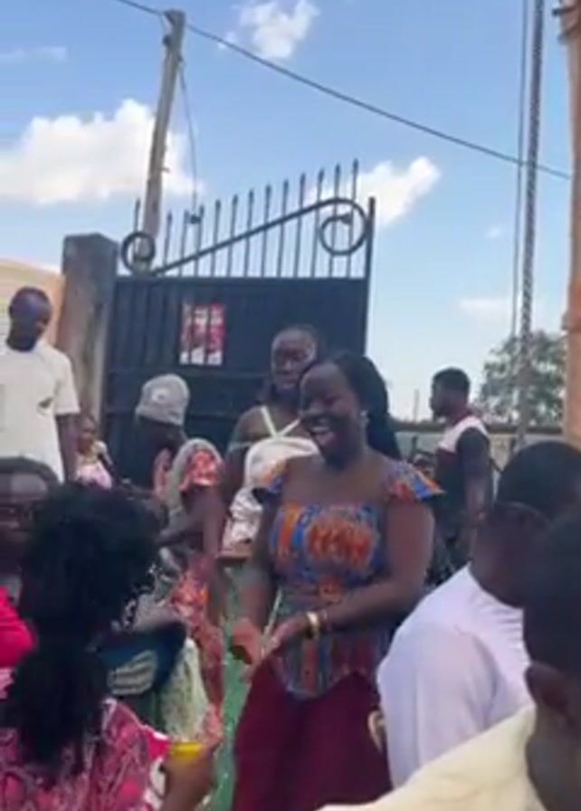 group of people dancing outside on a sunny day. Most of the dancers are women wearing colorful African-style dresses. One woman is wearing a green dress, another a pink top, and one has on a blue and orange print dress with a maroon skirt. Some of the dancers are smiling and laughing. There is a wrought iron gate in the background, as well as a draped pillar that may be part of an event setup. A few men are present but not actively dancing. A small child with curly hair is visible, also appearing to enjoy the music.