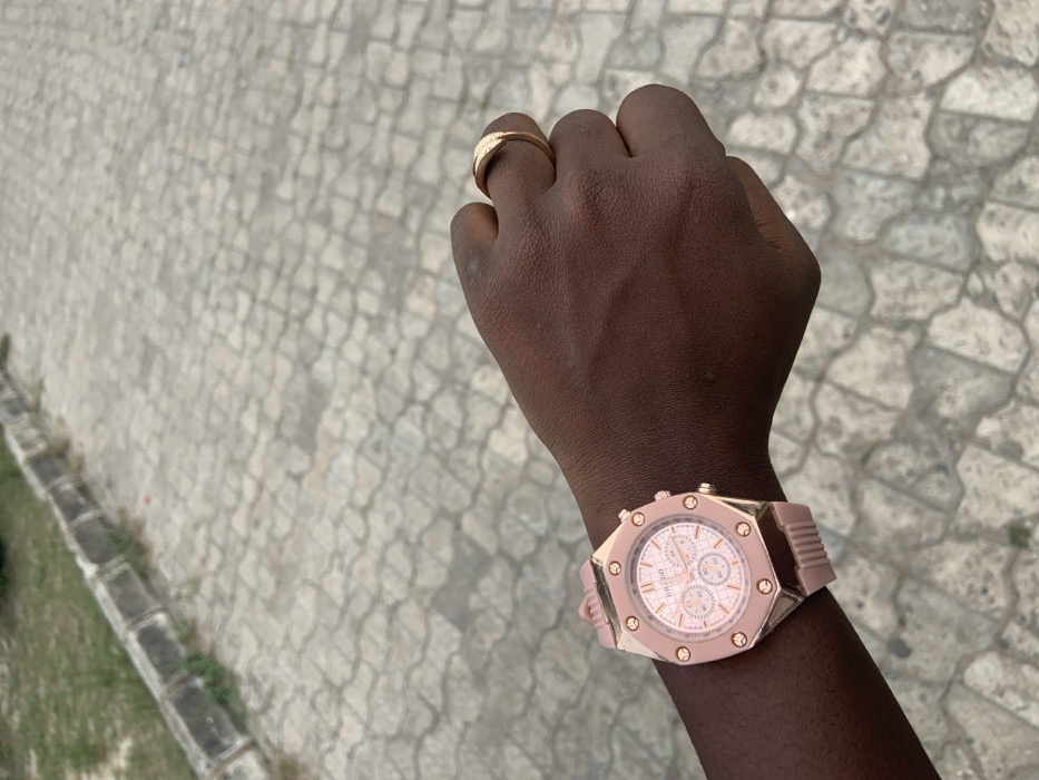A close-up view in Ijanikin, Nigeria, shows a dark-skinned human left arm and hand positioned over a paved outdoor surface. A rose gold-colored BRIDO watch, featuring an octagonal bezel with visible screws and three subdials, is worn on the wrist with a matching rose gold strap. A gold-toned ring with a textured, ribbed band adorns the ring finger of the hand, which is slightly clenched. The background consists of light gray interlocking pavers, with a concrete curb and a narrow strip of grass and dirt visible along the left side. Natural daylight illuminates the scene.