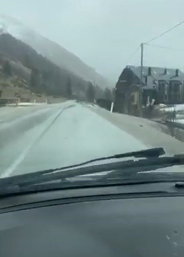 A car is driving on a wet, paved road on a cloudy day in a mountainous area. The windshield wipers are active. There is light snow on the ground in places. A building is visible on the right side of the road. Mountains are visible in the distance.
