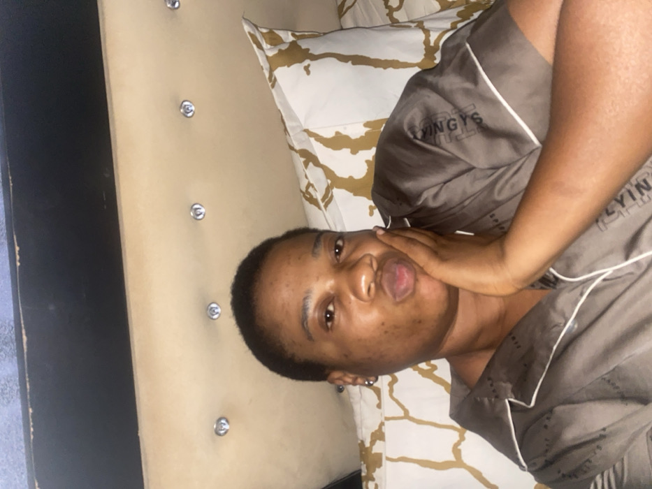 A single adult female, with short dark hair and brown skin, is depicted in a medium close-up, lying in what appears to be a bed. She is wearing a grey short-sleeved collared shirt with white piping and the text "LYINGYS" visible on the sleeve. Her lips are pursed, and her right hand is resting against her cheek. A silver hoop earring is visible in her left ear. The background consists of a light beige upholstered headboard with three visible silver-toned decorative studs, beneath a darker, possibly upholstered or wooden panel. A white pillow with a gold or tan abstract pattern is visible to the right of the subject. The specific location in Abuja, Nigeria, cannot be determined from the visual information provided in the image.