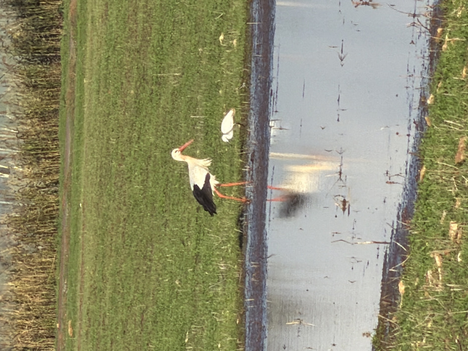 - "A white stork with a red beak stands on a grassy bank, extending its orange legs towards a body of water" by FM-vA9lX2, licensed under CC BY 4.0
