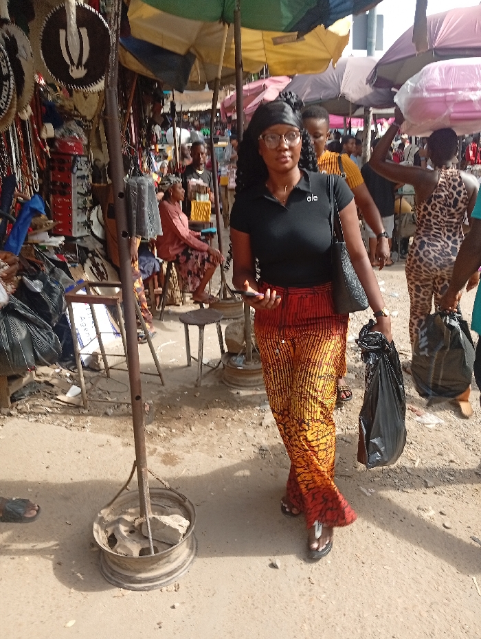 This image depicts a bustling outdoor market scene in Fegge, Nigeria, under daylight conditions. The primary subject is a Black female in the foreground, walking from left to right. She wears a black polo shirt with "alo" in white text on the left chest, a black headwrap, dark-rimmed glasses, and orange, red, and yellow patterned wide-leg trousers. Her footwear consists of black flip-flops. She holds a dark-colored smartphone in her left hand and a black plastic shopping bag in her right hand; a black handbag hangs from her right shoulder. To her immediate left, a makeshift stall pole made of metal is anchored in a car wheel rim filled with rocks, displaying various circular crafts, possibly decorative shields or mirrors, and beaded necklaces. Further into the midground on the left, numerous market stalls are visible under colorful umbrellas (green, yellow, brown, purple), offering shade. A woman in a red-patterned dress sits on a low stool behind one such stall. In the midground to the right of the primary subject, several individuals are present. A woman in a leopard-print jumpsuit balances a pink rectangular object on her head. Another person in a yellow shirt walks behind the primary subject. The ground is unpaved dirt or compacted earth, indicating a pedestrian thoroughfare. The scene is brightly lit, with visible shadows suggesting direct sunlight.