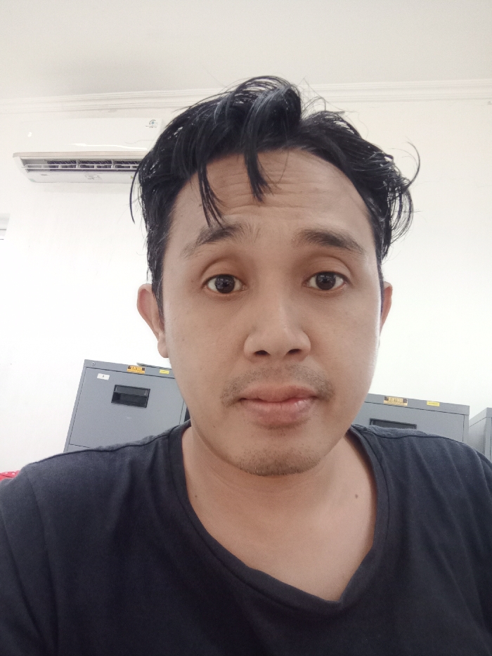 A man with black hair, brown eyes, and a slight mustache looks directly at the camera. He wears a black t-shirt. The background is white, with an air conditioner visible in the upper portion. Behind him are gray filing cabinets. The lighting is even.