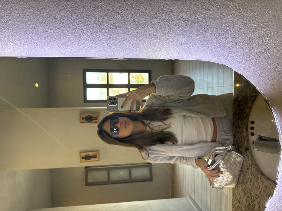 A woman in a white tank top and gray sweat suit takes a mirror selfie in a bathroom