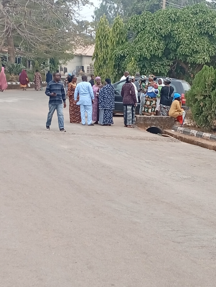 A group of people are gathered on a paved road near a curb. Some are standing and conversing, while one person is seated on the curb. A dark SUV is parked nearby, partially obscured by the group. Other individuals walk in the background. The surrounding area features trees and a building in the distance, suggesting a public or institutional setting.