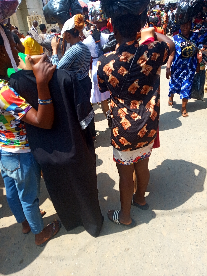 The image depicts a crowded outdoor market scene in Fegge, Nigeria, under bright daylight with strong shadows cast on the light-colored concrete ground. The perspective is slightly elevated, looking down into the crowd. In the left foreground, a person is partially visible, facing right, wearing a colorful short-sleeved t-shirt with cartoon characters (Mickey Mouse motifs), light blue denim jeans, and beaded brown flip-flops. A blue wristband is visible on their right arm, which is raised and appears to be touching the adjacent person. Immediately to the right of this individual, positioned slightly behind, is a person wearing a long, flowing black garment, possibly an abaya or hijab, with a patterned white and black border near the hem. This person is also facing right, with their back to the camera. In the right foreground, a third person is centrally featured from behind, facing right. This individual wears a black long-sleeved top patterned with numerous light brown, possibly animal-print or bear-like, motifs. Below this, a short skirt with a white base and multi-colored splatters is visible. They carry a flesh-toned mannequin torso, dressed with a red collar, on their left shoulder. A black shoulder bag strap crosses their back. They wear dark blue or black slip-on sandals with white stripes. In the midground, behind the central black-garbed figure, a person with light-colored hair in a bun wears a light blue and white striped long-sleeved top. Further back and to the right, a woman in a blue and white tie-dye patterned dress, featuring a prominent yellow "GUCCI" logo, carries a large black plastic bag on her head and wears brown flip-flops. Numerous other indistinct figures, some also carrying items on their heads, are visible in the background, indicating a bustling marketplace with various stalls and merchandise, though specific items are largely obscured by the crowd.