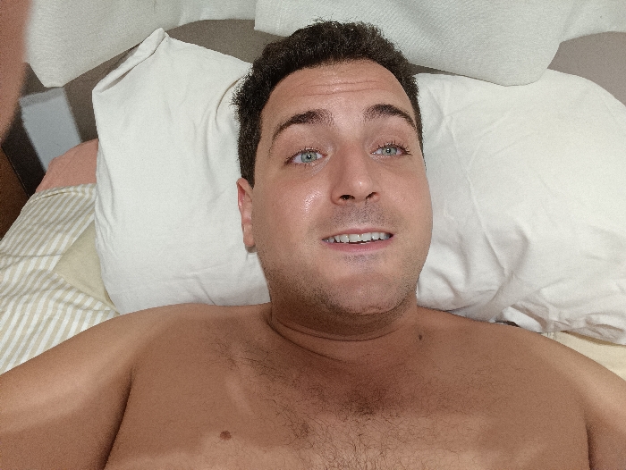 A person with short, dark hair and blue eyes lies on a bed. The person is topless, revealing a tan line across their chest and shoulders. They are positioned on a striped sheet with a white pillow behind their head. The person is looking directly at the camera with a slightly open mouth and a faint smile. The skin on their face appears somewhat shiny.