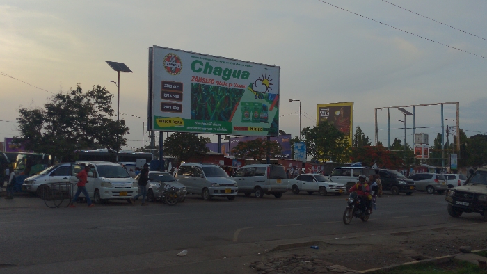 A street scene with vehicles, including cars, vans, and a motorcycle. A large billboard promoting "Chagua ZAMSEED" is visible. Other advertisements are present in the background. The sky is overcast, and the overall lighting suggests it is late afternoon or early morning. Pedestrians are present, engaging in street activity. Solar panel streetlights are positioned near the billboard.