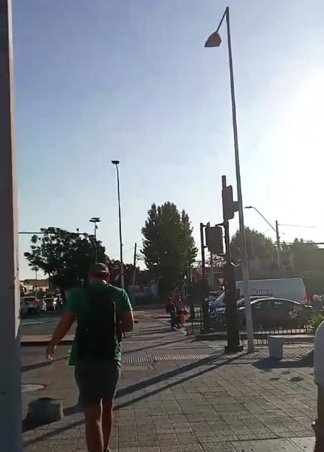A man in a green shirt, gray shorts, white socks, and black-and-white shoes walks away from the camera across a tiled sidewalk. He carries a black backpack. He passes a light post and approaches a crosswalk where a traffic light shows green. There are cars and a white van visible in the background. The sky is bright and blue. The scene appears to be outdoors during the day. There are other pedestrians in the background, near the crosswalk. A concrete bench sits to the right of the sidewalk.
