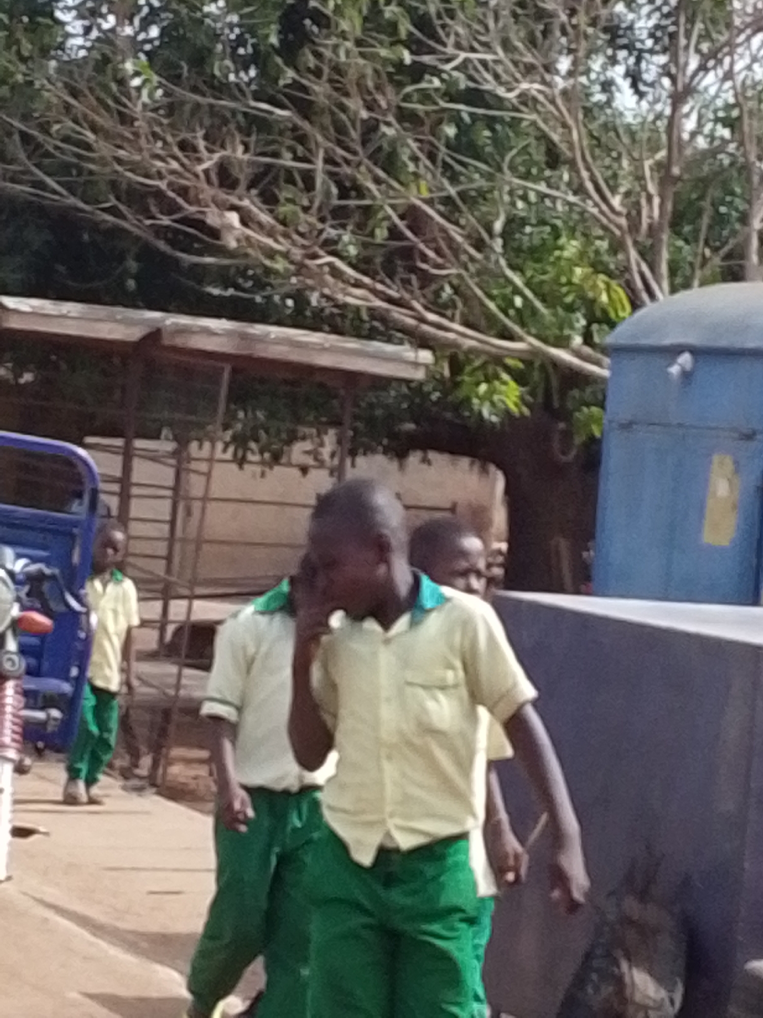 three boys wearing school uniforms consisting of yellow shirts and green trousers. The boy in the foreground is darker-skinned and appears to be talking on a phone. The second boy, positioned to the left and slightly behind the first, wears the same uniform. A third boy, also in school uniform, is seen further in the background, near a parked blue motorized tricycle. Behind the boys is a structure with a roof, possibly a shelter or storefront. Trees with bare branches and green foliage are overhead. A blue rectangular structure is to the right. The ground surface is light-colored, suggesting a road or walkway. The location of the image is assumed to be in the city of Tamale, Ghana. The uniforms and general surroundings suggest a school or residential area.