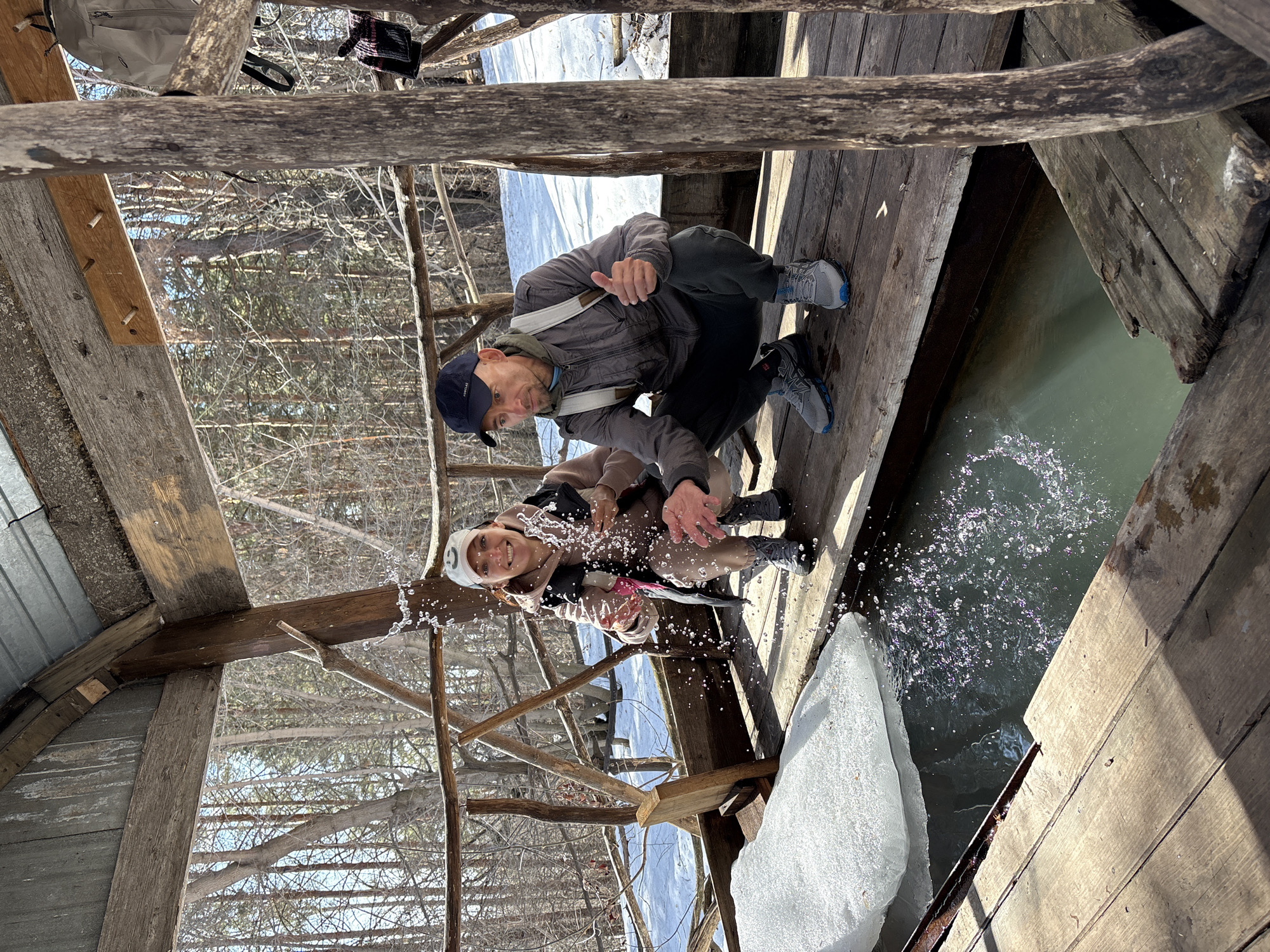 man and a woman splashing water near an ice-covered pool in what appears to be a wooden structure